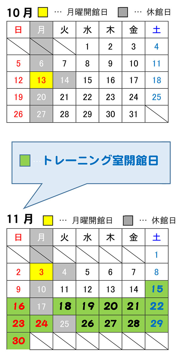 トレーニング室は(定期休館日)を除き、10時から17時までご利用可能です。